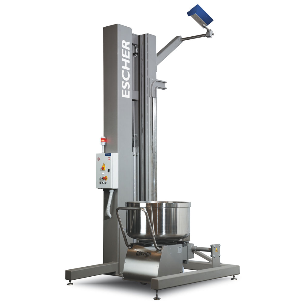 Der Hebekipper ESBL von Escher Mixer ist ein spezialisiertes Gerät, das hauptsächlich in der Bäckerei- und Lebensmittelindustrie verwendet wird. Es ist dafür konzipiert, Teigwannen oder Zutatenbehälter anzuheben und ihren Inhalt in Knetmaschinen oder andere Verarbeitungseinheiten zu entleeren.