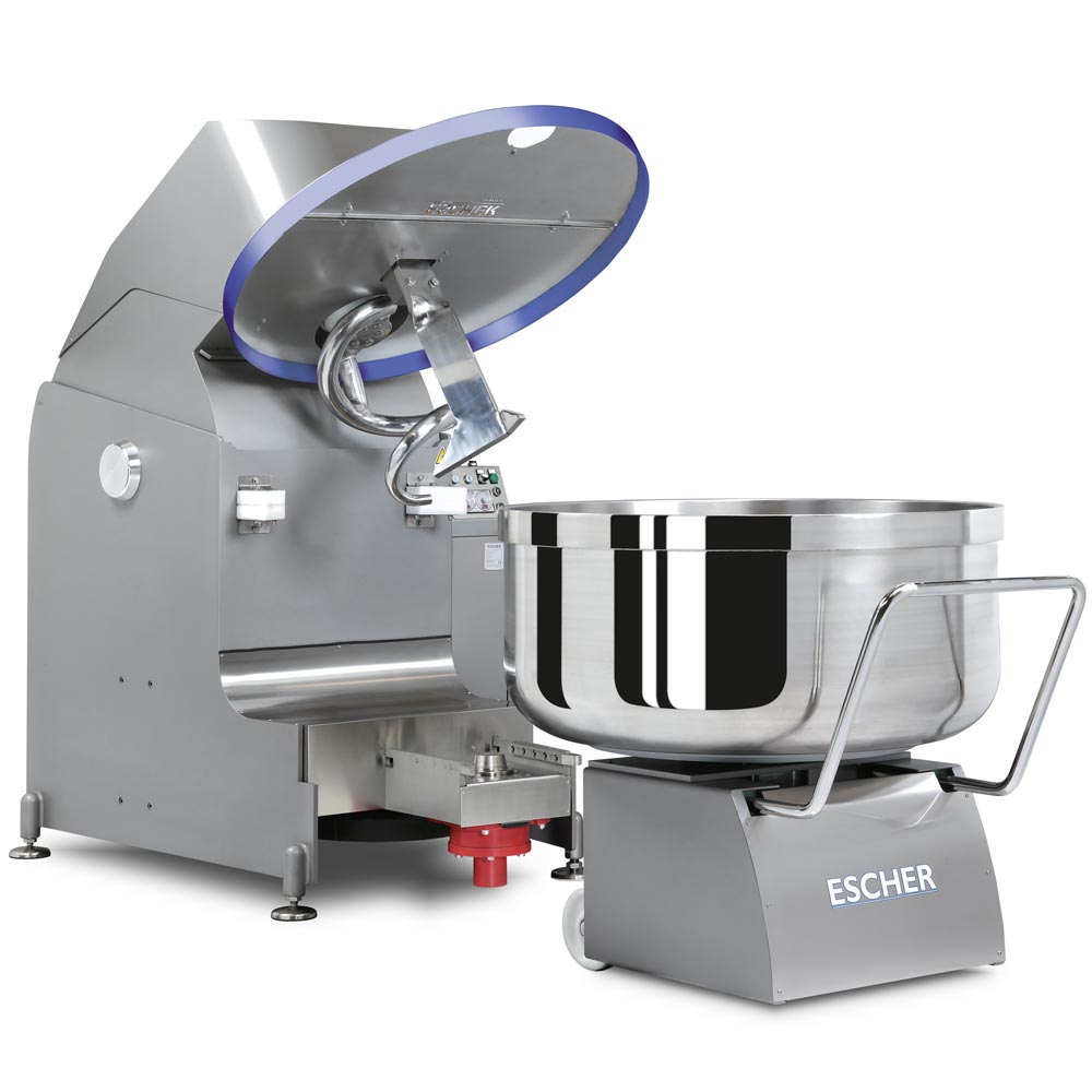 Die Spiraknetmaschiner von Escher Mixer decken mit ihren Baugrößen die gesamte Bandbreite für semi-industrielle und industrielle Anwendung. Für verlangte höchste Qualität erfüllen diese die Voraussetzung im höchsten Maß. Mit den Spiralkneter können z.B. 160 und 240 kg Teig im 3-Schichtbetrieb verarbeitet werden. Dank der patentierten verschleißfreien hydraulischen Konus-Kesselsverriegelung lassen sich die Teigschalen mit einfachem Handling ausfahren.