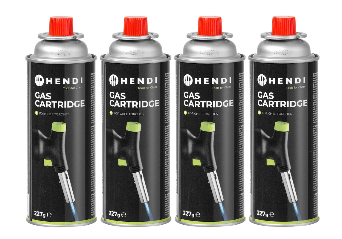 Für die Verwendung mit den HENDI Crème-Brûlée Brenner 18657. Nicht zum Nachfüllen von zB Gasfeuerzeugen geeignet. In Sets zu je 4 Kartuschen verpackt.